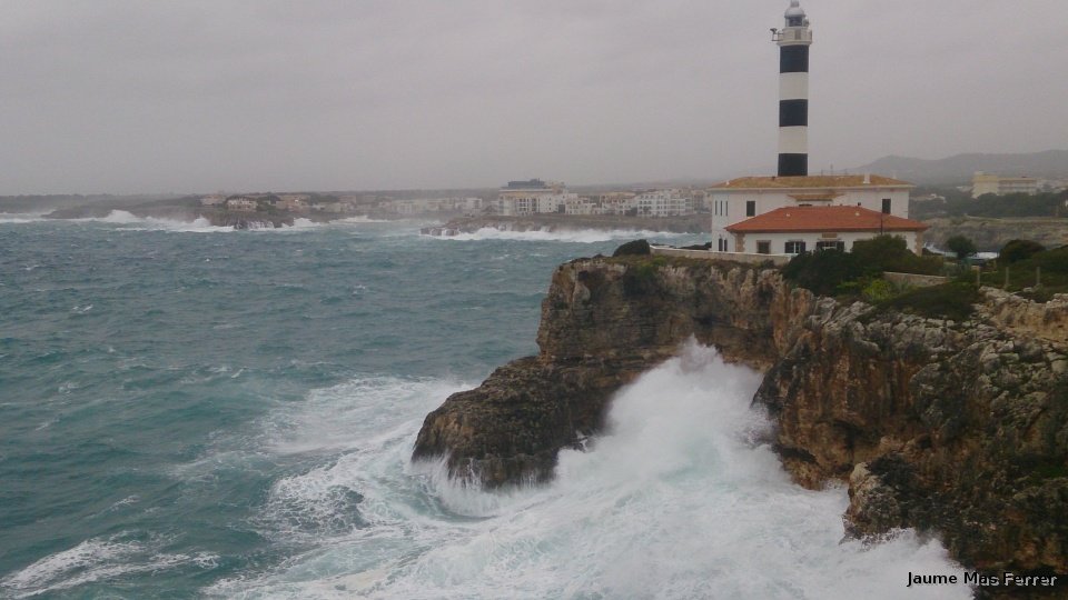 Sa Punta de Ses Crestes dia 29-03-2014, un senyor temporal de Llevant deixant la mar blanca abaix el far de Portocolom.