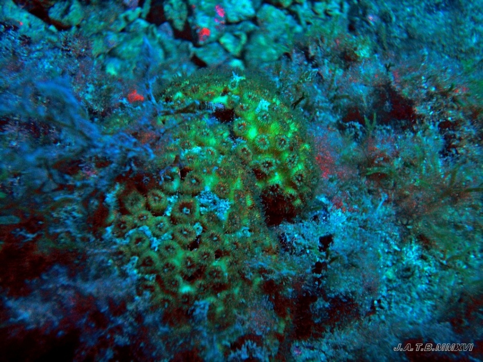 Esta foto esta hecha con filtros especiales para distinguir la luminiscencia de los pólipos de la acropora mediterránea.