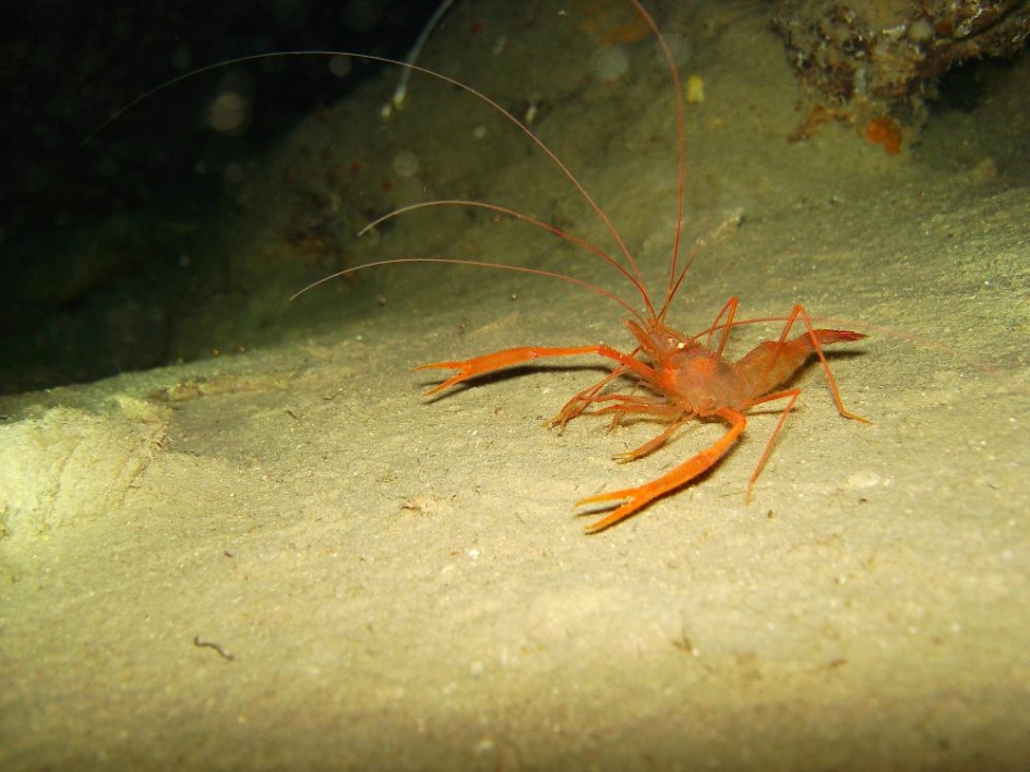 De unos 7cm esta gamba habita desde pocos metros hasta los 700m, durante el día están escondidas dentro de cuevas y por la noche salen en busca de alimento.