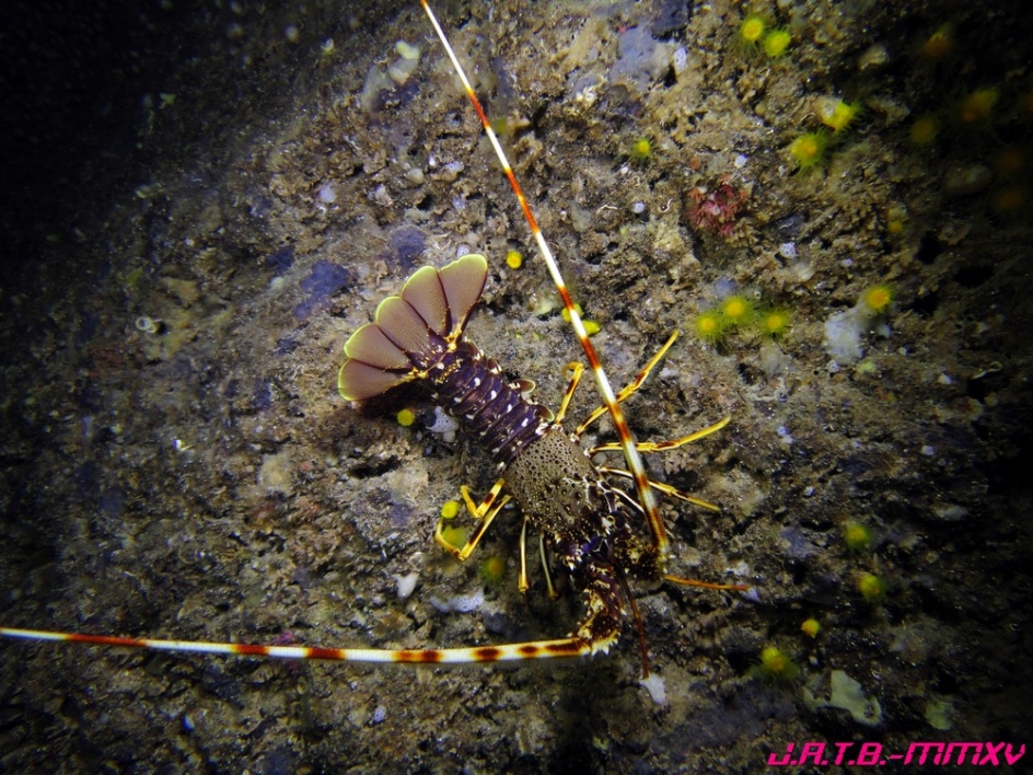 Bienvenido / Fotografias Submarinas / Fotografías Submarinas de Juan A. Torres / PEQUEÑA LANGOSTA POR LA PARED DE UNA CUEVA