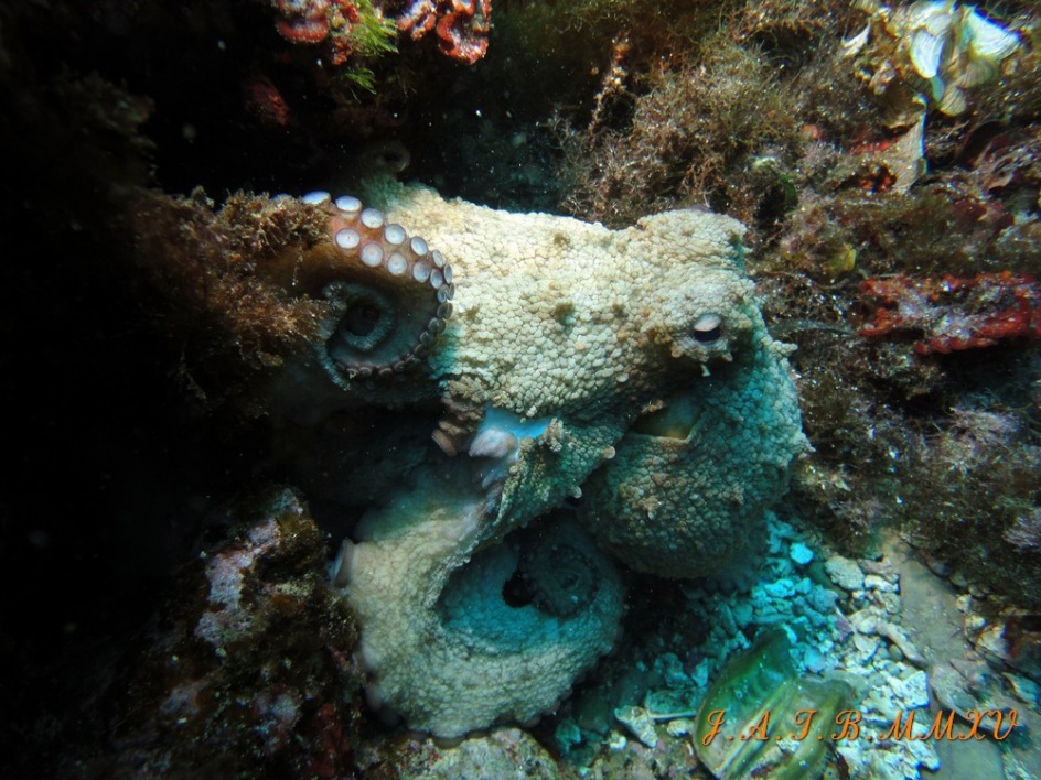 Aun que no se puede apreciar con detalle este ejemplar estaba devorando a otro pulpo ya que entre ellos existe el canibalismo, tras las peleas entre machos.